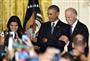 11月24日、ホワイトハウスでの記者会見で、フランスのフランソワ・オランド大統領(左)を抱きしめるバラク・オバマ米大統領。両首脳は「イスラム国」への空爆拡大で合意したが、会談をリードしたのはオランド氏で、オバマ氏はどこまでも受け身だった=2015年、米国・首都ワシントン(UPI=共同)【拡大】