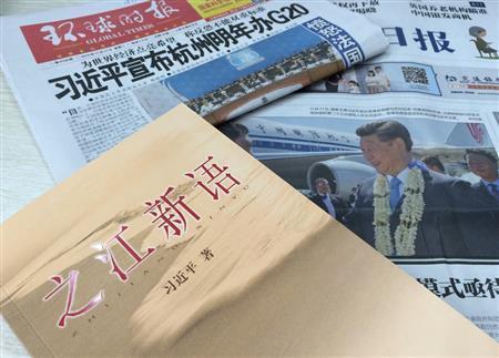 習近平国家主席(党総書記)が浙江省トップの党委書記などを務めた2003~07年に地元紙、浙江日報に寄稿したコラムから232本を選んだ書籍「之江新語」と、中国が初めてホスト国となる来年の20カ国・地域(G20)首脳会議の開催地を浙江省杭州に決めたことなどを伝える中国紙=2015年12月1日(河崎真澄撮影)【拡大】
