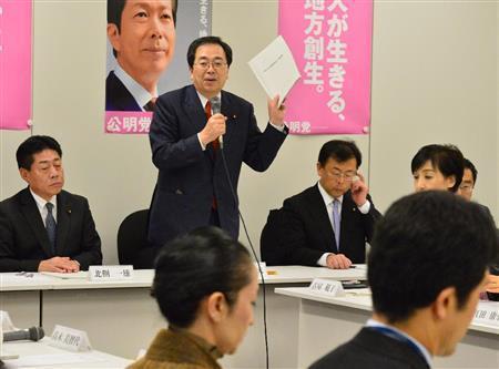 公明党税制調査会総会などの合同会議で、税制改正大綱案の資料を手にあいさつする斉藤鉄夫税調会長(奥左から2人目)。来夏の参院選を控え、軽減税率でひとまず自民党から譲歩を引き出した形だ=2015年12月10日午後、東京都千代田区永田町の衆院第二議員会館(斎藤良雄撮影)【拡大】