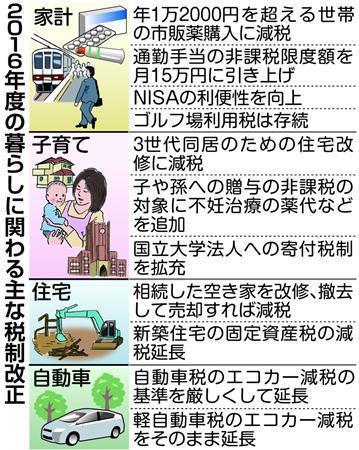 消費の下支え策として、訪日客が消費税免税を受けられる一般物品の最低販売額を1万円超から5000円以上に下げ、訪日客による消費拡大の恩恵を幅広く受けられるようにする。17年4月に廃止する自動車取得税の代わりに導入する燃費性能に応じた自動車新税は取得税より負担を総額で200億円軽くする。消費税再増税後に予想される新車販売の低迷などに配慮した。