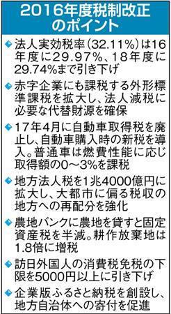 自民、公明両党は10日、それぞれ税制調査会を開き、消費税の軽減税率制度を除く2016年度税制改正大綱を了承した。法人税の実効税率を現在の32.11%から来年度29.97%に引き下げることを盛り込むなど、企業の活性化に力点を置いたのが特徴だ。自公両党の幹事長による協議を経て軽減税率の合意内容を追加し、その上で与党税制改正大綱を決定する。