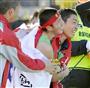 往路優勝のテープを切り、1区・久保田和真(かずま、左)と2区・一色恭志(いっしき・ただし、右)に迎えられる青山学院大学の5区・神野大地(かみの・だいち)=2015年1月2日、神奈川県足柄下郡箱根町の芦ノ湖(蔵賢斗撮影)【拡大】