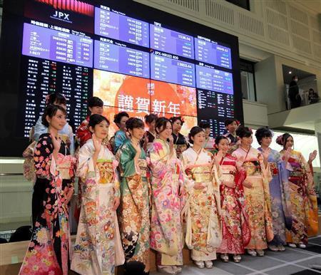 東京証券取引所で行われた大発会で、株価ボードの前に並んで記念撮影をする晴れ着姿の女性たち=2016年1月4日、東京都中央区(早坂洋祐撮影)【拡大】