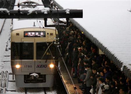 積雪は朝の通勤時間帯と重なり、電車内や駅は大混雑した。JR山手線や京浜東北線は大幅に遅れ、川越線などで架線が切れるトラブルがあり、一部区間で運転を見合わせた。相模鉄道も架線切断で全線が一時ストップし約8万4000人に影響した。東海道新幹線は品川-小田原間で通常より速度を落として運行し約1万1000人に影響した。
