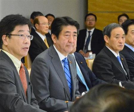 1億総活躍国民会議に臨む(左から)加藤勝信1億総活躍担当相、安倍晋三(しんぞう)首相ら=2016年1月29日午後、首相官邸(斎藤良雄撮影)【拡大】