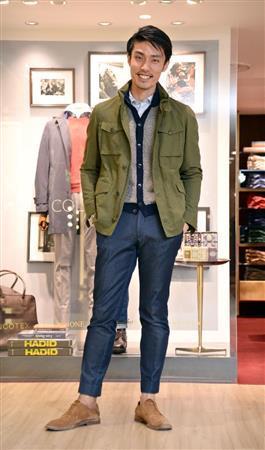 「THE_SLOWEAR_STORE」のカジュアルコーディネートは、アメリカンカジュアルとは一味違う、イタリアのだて男らしさが感じられる。フィールドジャケット(MONTEDORO、12万円)、シャツ(GLANSHIRT、3万2000円)、カーディガン(ZANONE、5万2000円)、デニムスラックス(INCOTEX、3万2000円)=2016年2月1日、東京都中央区(寺河内美奈撮影)【拡大】