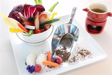 まずは、ディナーメニューから人気の「大地のめぐみバーニャカウダ」(1800円)を。聖護院大根、金時人参(にんじん)、万願寺唐辛子などの京野菜をはじめ12種の野菜が盛られた皿は見た目も遊び心たっぷりだ。「土から掘り起こしたばかりの新鮮な野菜をイメージしています」とイタリアや都内のイタリア料理店で修業を積んだシェフの大塚明さん。