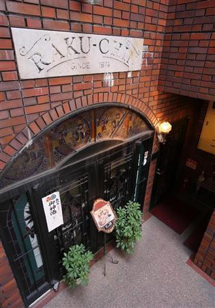 れんが造りにステンドグラス、串揚げの店とは思えないレトロな外観。7月末まで行われた祗園祭では「御神酒」奉納をした証しが貼られていた=7月19日、京都市中京区