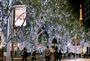 東京タワー1階正面玄関に登場したクリスマスツリーは、オレンジ色の東京タワーとの競演が見物だ=11月3日、東京都港区(財満朝則撮影)