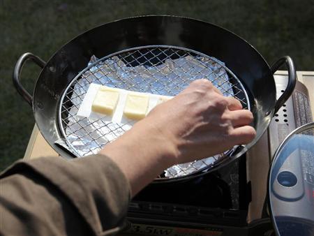 (手順3)食材を並べる。★ポイント1=チーズの場合は、熱で溶けて網から落ちてしまうため、クッキングシートを敷いておく。カマンベールチーズはアルミホイルでトレーを作ってその上に乗せる。★ポイント2=複数の食材を同時に燻製してもいいが、匂いが混ざるのを防ぐため魚と肉など匂いの強いもの同士はNG。★ポイント3=タラコは最初から入れると火が通りすぎてしまうため、煙が出てから入れる(宮崎裕士撮影)