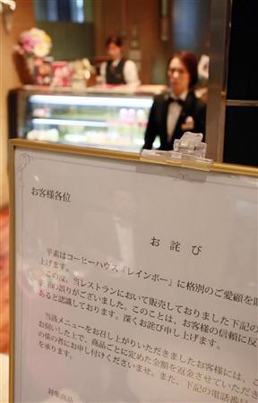大阪市内のレストランでメニュー表示と異なる食材を使用していたことに端を発して全国のホテルやレストラン、百貨店などで偽装が明らかになった。写真はおわびを掲示する、偽装のあったホテルのレストラン=2013年10月23日、大阪市北区(松永渉平撮影)
