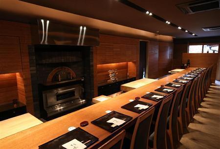 約10メートルのマホガニーの一枚板でできたメーンのカウンター席(全17席)。中央には何と「ピザ窯」も=2013年12月18日、京都市東山区(恵守乾撮影)