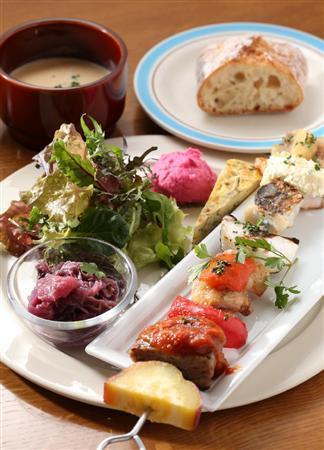 昼限定の「ジャンボブロシェットランチ」(950円)。1本の金串に錦雲豚やタルタルソースがついた海老、ハンバーグ、パプリカなど8種類が通されている。サラダにオムレツ、スープがついているので男性でもおなかいっぱいに