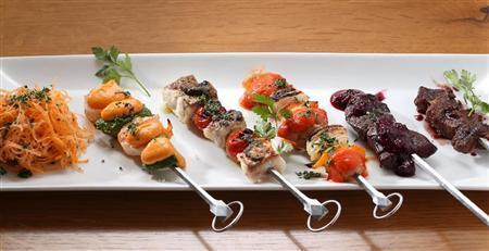 「ブロシェットおまかせ盛り合わせ五種」(1480円)。左からキャロットのラベ、エビとアボカドのロメスコソース、イトヨリのタプナード、丹波地鶏、エゾジカのベリーソース、イベリコ豚の赤ワインソース。冬の時期ならではのジビエの串もお目見えする