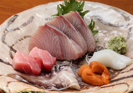 天然魚の盛り合せ(1800円)は、中央市場で仕入れられた新鮮なブリ、マグロ、トリガイ、ウニ、イカ。季節ごとに旬の魚が出される