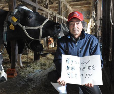 2011年4月6日には、「死ぬまでやるよ!ちちしぼり」と宣言。原発事故の影響で出荷停止になり、搾った生乳を畑に捨てていたこともあったが「負けないぞ!」と、3年後の今も酪農を営んでいる=2014年2月22日、福島県二本松市(植村光貴撮影)