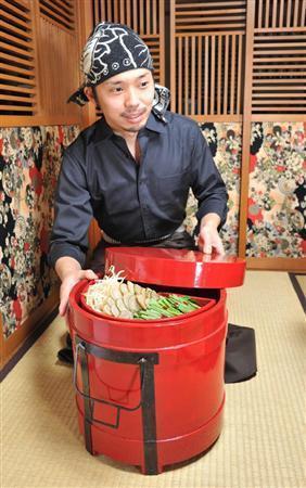 もつ鍋の具材が入った豊臣秀吉ゆかりの「陣中弁当箱」=2014年2月26日、京都市中京区(竹川禎一郎撮影)