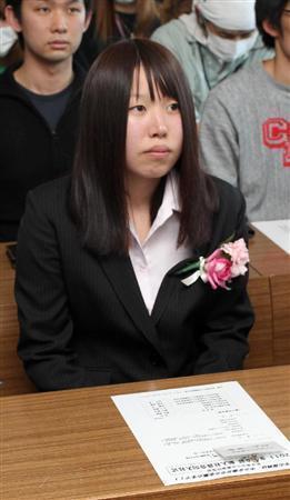 八木澤商店の入社式に臨んだ村上愛季さん。陸前高田、大船渡両市内の企業3社が合同で入社式を行い、新たな社会の門出を祝福された=2011年4月6日、岩手県陸前高田市(矢島康弘撮影)