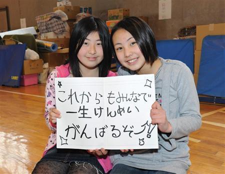 小学校からの仲良し小野寺夏美さん(左)と若生胡桃さん。一緒に避難生活を送る避難所で前向きな明るいメッセージを書いた=2011年4月24日、宮城県亘理郡亘理町(寺河内美奈撮影)