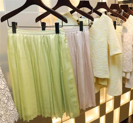 春らしいプリーツスカートは「essence_of_ANAYI」のもの。各1万8900円