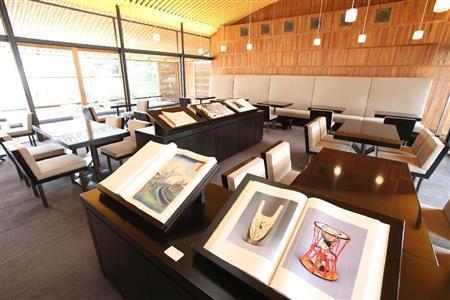 ゆったりとした「虎屋菓寮」の店内。貴重な本が並べられ、閲覧もできる=2014年3月17日、京都市上京