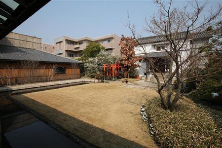 蔵を中心に、梅や桜など季節の花が迎えてくれる「虎屋菓寮」の庭=2014年3月17日、京都市上京区