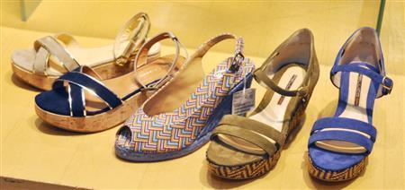 上品なスエード皮の本体にエスニック模様のソールなど…今年はサンダルもミックステイストが流行中=2014年3月3日、東京都中央区(伴龍二撮影)