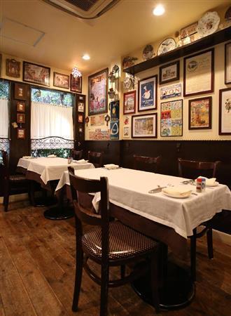 パリのビストロを思わせるかわいらしい雰囲気の店内。食器や壁の絵などはすべてフランスで買い付けたもの=2014年3月26日、京都市中京区(恵守乾撮影)