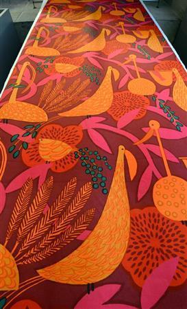赤系統を基本に5色を重ねて手作業でプリントした「オッタイピイヌ」の鳥柄のテキスタイル。色が重なりあうことで、ほんわかとした輪郭がうまれる