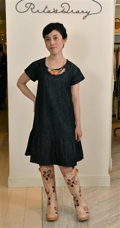 レインブーツで重たく見える足元を、裾にボリュームのあるワンピースでバランスを整えた。ハンターのブーツ(1万6000円)、ビリティス_ディセッタンのドレス(2万8000円)、スタイリズムのネックレス(1万3600円)=2014年6月4日、東京都中央区(栗橋隆悦撮影)