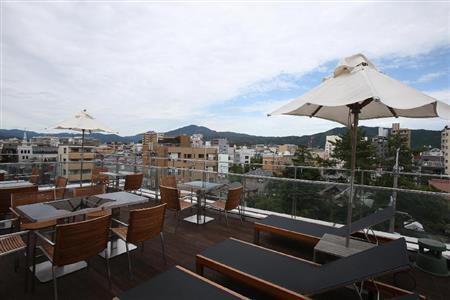 京都御苑や如意ヶ岳、寺町通りの街並を見渡せるオープンテラスの“そら床”は期間限定でオープン=2014年8月21日、京都市中京区(恵守乾撮影)