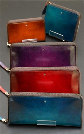 深い色合いが特徴の「YUHAKU」の革小物(大3万5000円、中3万100円、小2万2000円)=2014年9月3日、東京都中央区銀座(寺河内美奈撮影)