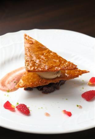 グランデセール「ミルフイユ・フィグ」(1800円)は、ドライ無花果の赤ワイン漬け、エスプレッソアイスクリーム、キャラメリゼしたパイ生地を層にしたデザート。※価格はすべて税別です=2014年9月11日、京都市中京区(恵守乾撮影)
