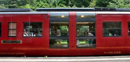 大畑(おこば)駅で停車した「いさぶろう・しんぺい」。車両中央部のガラス張りの展望スペースが特徴的だ=2014年7月28日、熊本県人吉市(鈴木健児撮影)