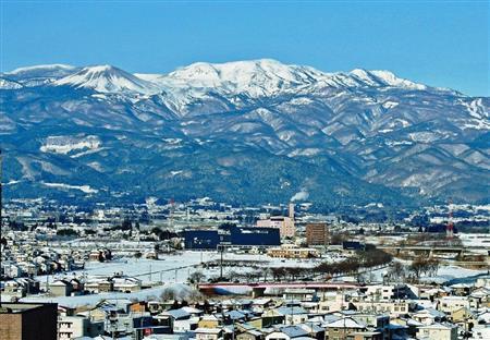 吾妻小富士と吾妻山。裾野に広がるのは福島県福島市の中心街=2015年1月19日(唐木英明さん提供)