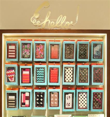 iPhoneケースは新機種「6」向けが大人気、気球やウインク柄など遊び心満載のデザインも。「5」「5S」とも3800円=2015年1月28日、東京都中央区(宮崎裕士撮影)