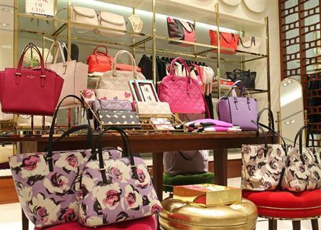 色、柄ともにさまざまなデザインがそろう。バラの花柄バッグ(左下と右下)は大3万8000円、小4万1000円。スクエアバッグ小(上段左端と右端)4万5000円、大(上段の左から2番目)5万4000円。キルティングバッグ(上段右から2、3番目)6万7000円=2015年1月28日、東京都中央区(宮崎裕士撮影)