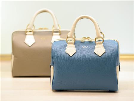 A.D.M.J.の小ぶりのボストンバッグ(4万5000円)は白のライン使いがアクセント。グレージュ(左)、ブルー(右)など春らしい色がそろった=2015年2月2日、東京都中央区銀座(川口良介撮影)