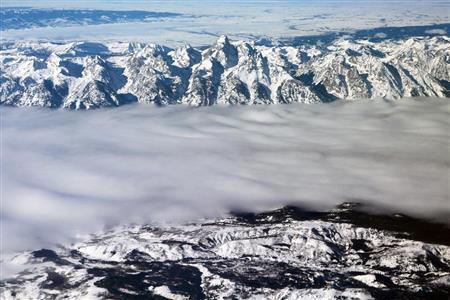 ティトン連山の東の麓。濃い霧に包まれるジャクソンホール=2015年1月9日、米ワイオミング州のグランドティトン国立公園(佐藤良一さん撮影)