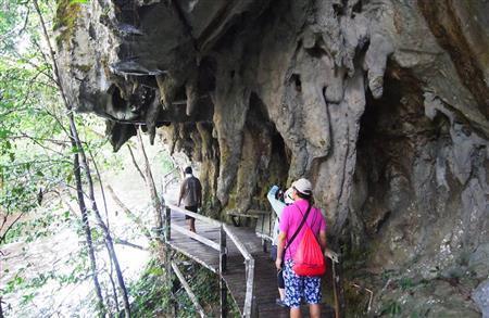 岩壁に沿ってクリアウォーター洞窟へ向かう=2014年12月20日、マレーシア・サラワク州(ボルネオ島、杉山みどり撮影)