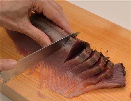 かつおのサラダ、かつおのづけ__(材料)かつお。(1)包丁の刃先を身に入れる(栗橋隆悦撮影)
