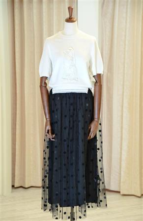 白い二ットは、よくみるとペンギン模様が浮き出るデザイン(3万4000円)。黒スカート(4万7000円)はチュールに水玉模様を散りばめ、都会的でいて繊細な装い。いずれもMuveil(Rita’s_Diary)=2015年4月27日、東京都中央区(寺河内美奈撮影)