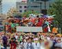 福島わらじまつりのパレードでは、ぐっと沿道の観客の方に近寄って大サービス=2015年5月30日、秋田県秋田市(松本健吾撮影)