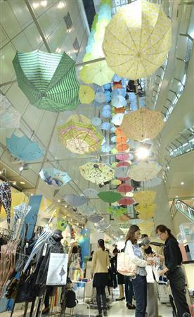松屋銀座で毎年6月恒例の、傘の花が咲く「GINZAの百傘会」。色とりどりの傘が天井から降るように並べられる=2015年6月3日、東京都中央区(寺河内美奈撮影)