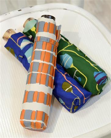 折り畳み傘もカラーやデザインが豊富。coccaからはトレンドの幾何学模様を手描き風にアレンジしてプリントした温もりのあるデザインが登場(1万円)=2015年6月3日、東京都中央区銀座(寺河内美奈撮影)
