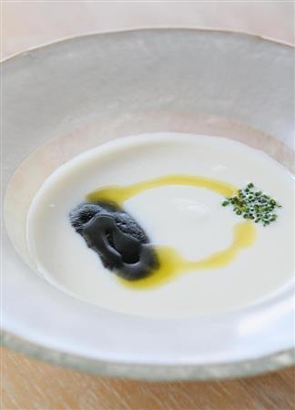 かぶらと玉ねぎの冷製クリームスープ。焼き茄子のピューレで味の変化を楽しめる=2015年6月17日、京都市下京区(志儀駒貴撮影)