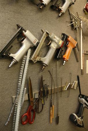 自作の針やタッカーなど張り替えに必要な道具が壁に掛けられている=2015年6月15日、京都市上京区(志儀駒貴撮影)