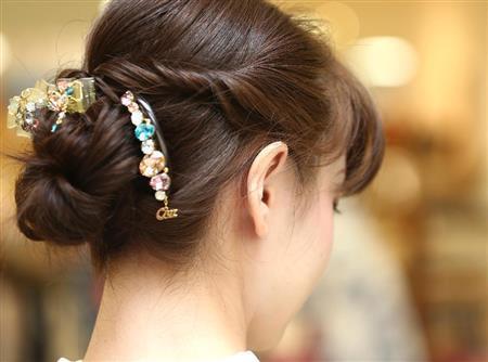アップにした髪には涼しげで揺れるアクセサリーが似合う。パステルカラーのクリスタルをあしらったコンプレックス_ビズのタルトコーム(右、1万4000円)とデザートクリップ(中7000円、左1万2000円)=2015年7月2日、東京都中央区銀座(福島範和撮影)
