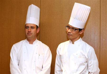 「日本の豚肉は柔らかくヘルシー」と語るシェフのエティエン・トゥルーターさん(左)と皆川和國副料理長=2015年6月30日、京都市東山区(志儀駒貴撮影)