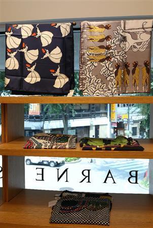 踊り子や動物、植物などを幾何学模様風にデザインした、今年のトレンドを反映するキンロックのスカーフ(上段2点、各2万9000円)=2015年7月27日、東京都新宿区(小野淳一撮影)